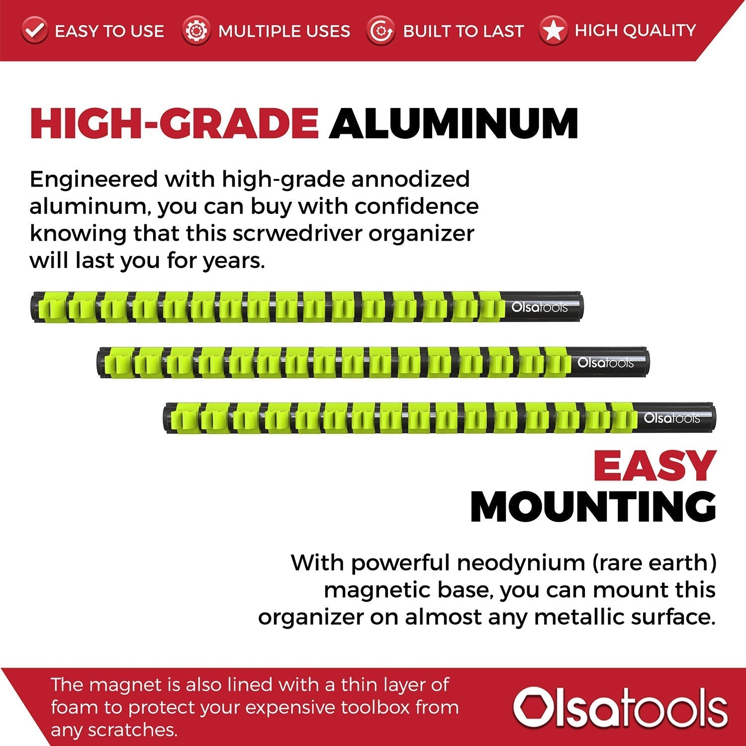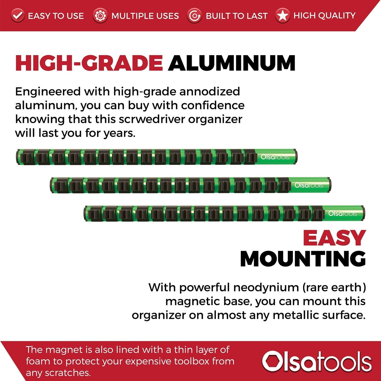 Get more space in your toolbox with this magnetic screwdriver organizer, you can place it onto most steel surfaces. It is engineered with ultra-strong rare earth (neodymium) magnets to maintain unmatched strength when loaded with tools, and is backed with a thin layer of foam over the magnet to protect the mounting surface.