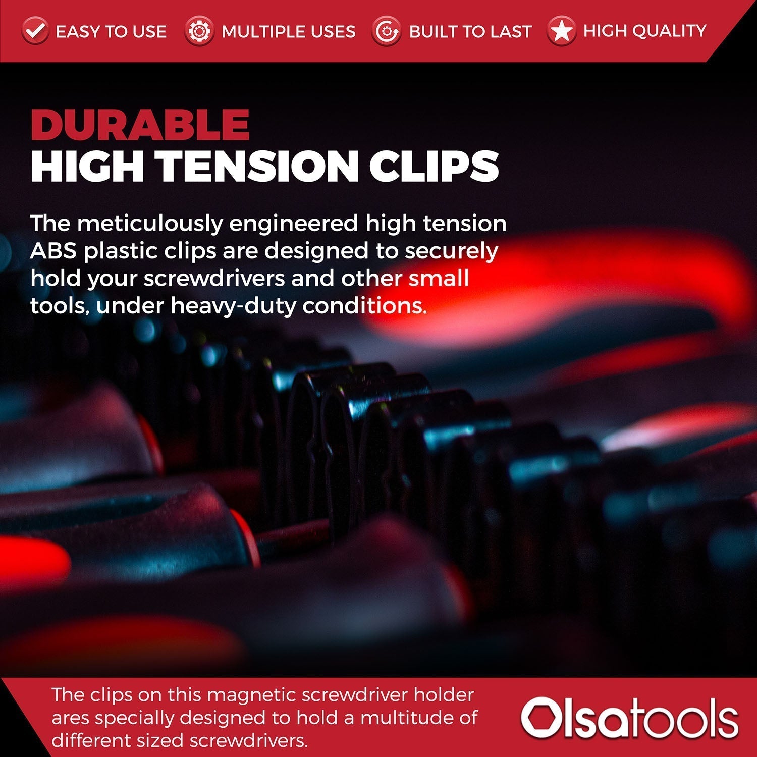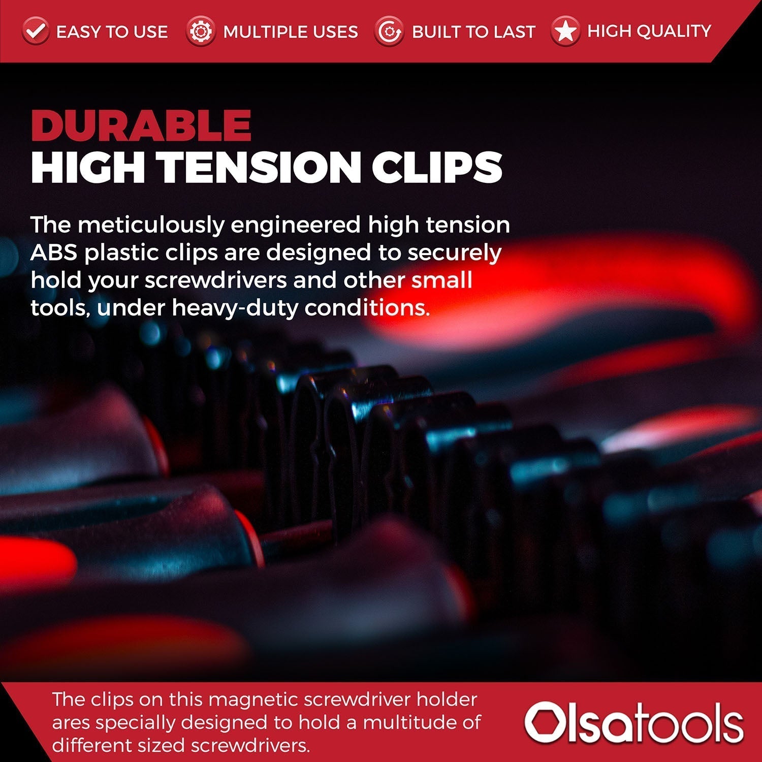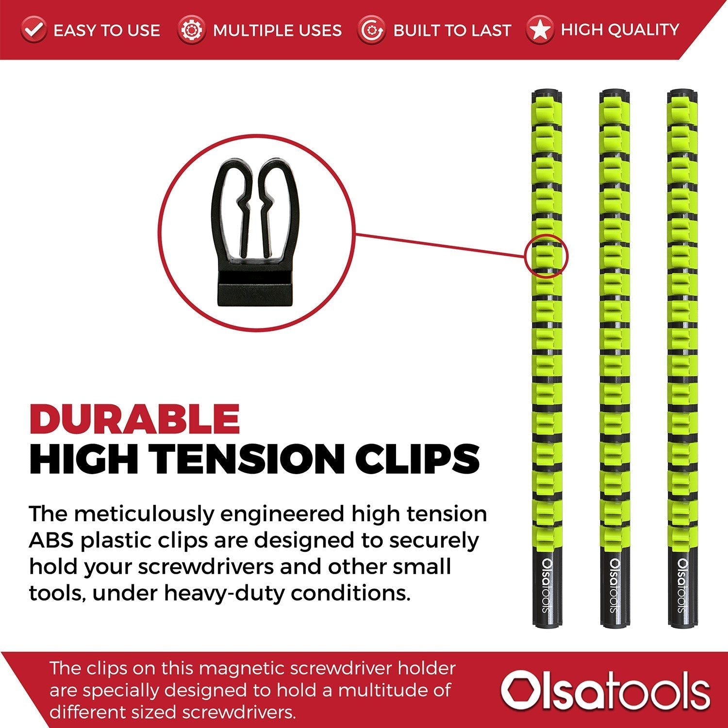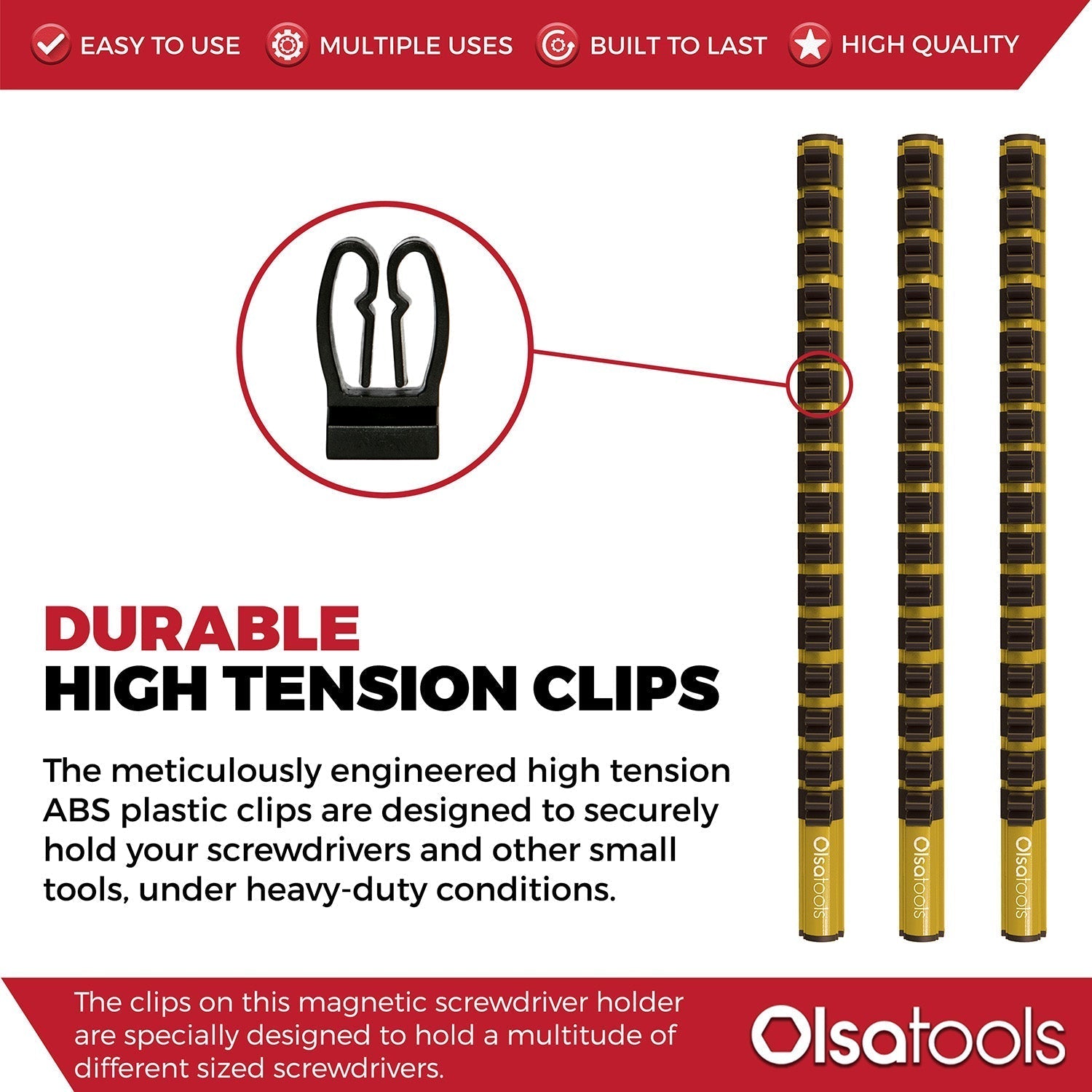 The clips on this magnetic screwdriver holder are specially designed to hold a multitude of different-sized screwdrivers, whether they are pointed up or down. You can even hold ratchets & wrenches, or other small tools. The tension clips securely hold the tools in place but can be removed with minimal effort.
