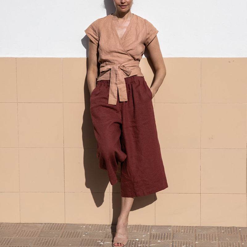 Casual Summer Lace-up Cotton Linen V-neck Top Short-sleeved blouse top women