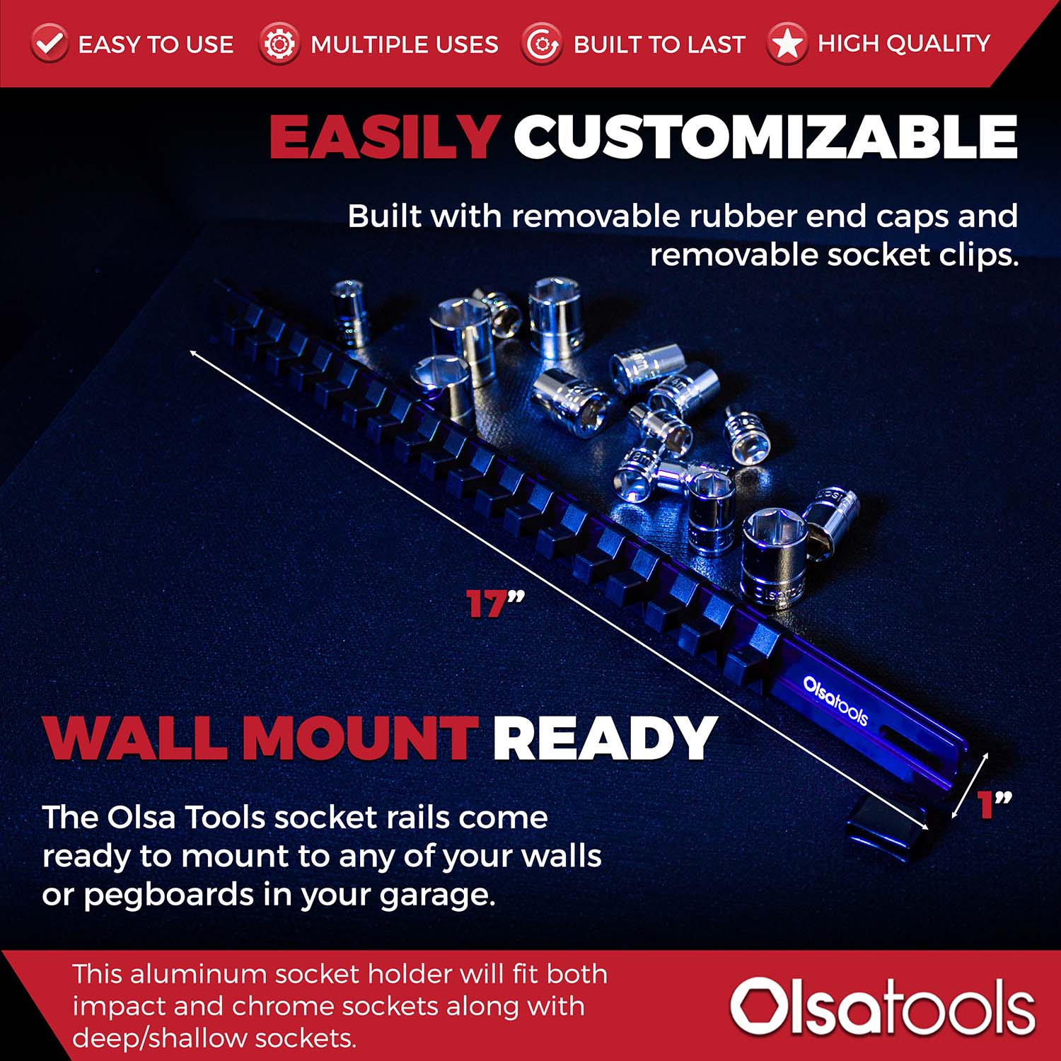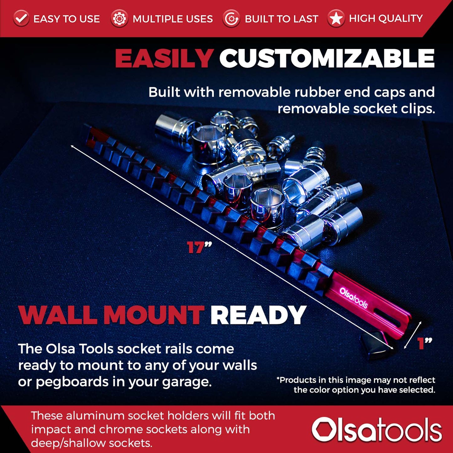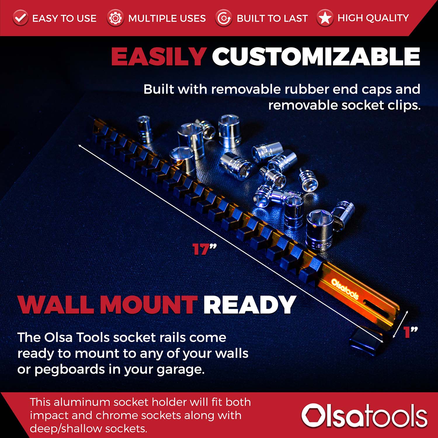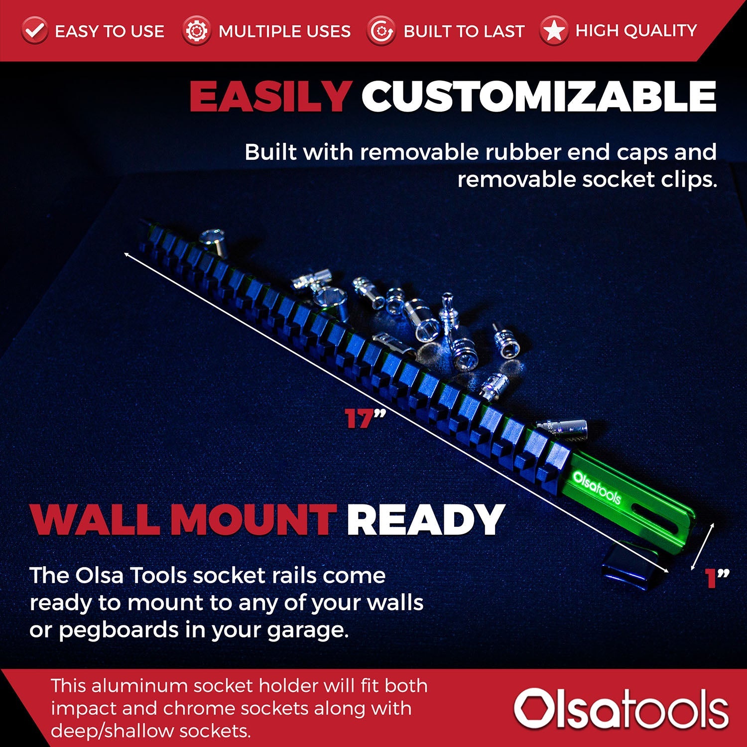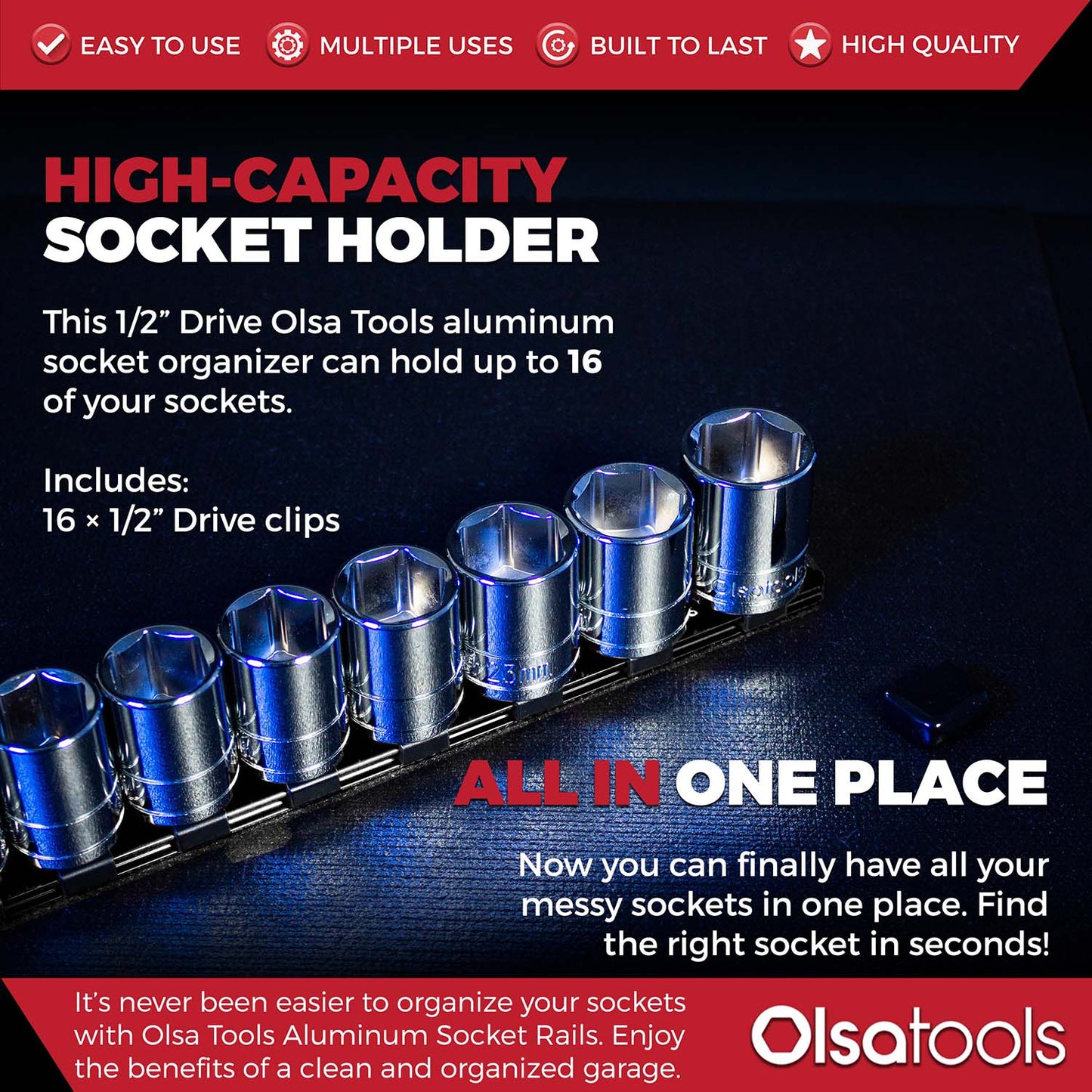- With the Olsa Tools aluminum socket rails, you can make the most out of your time by spending more time working instead of wasting time looking for loose sockets. Easily organize up to 58 (16x - 1/2-inch, 24x - 1/4-inch, 18x - 3/8-inch) with a 3 pc kit or get individual rails for the perfect set up for your toolbox.