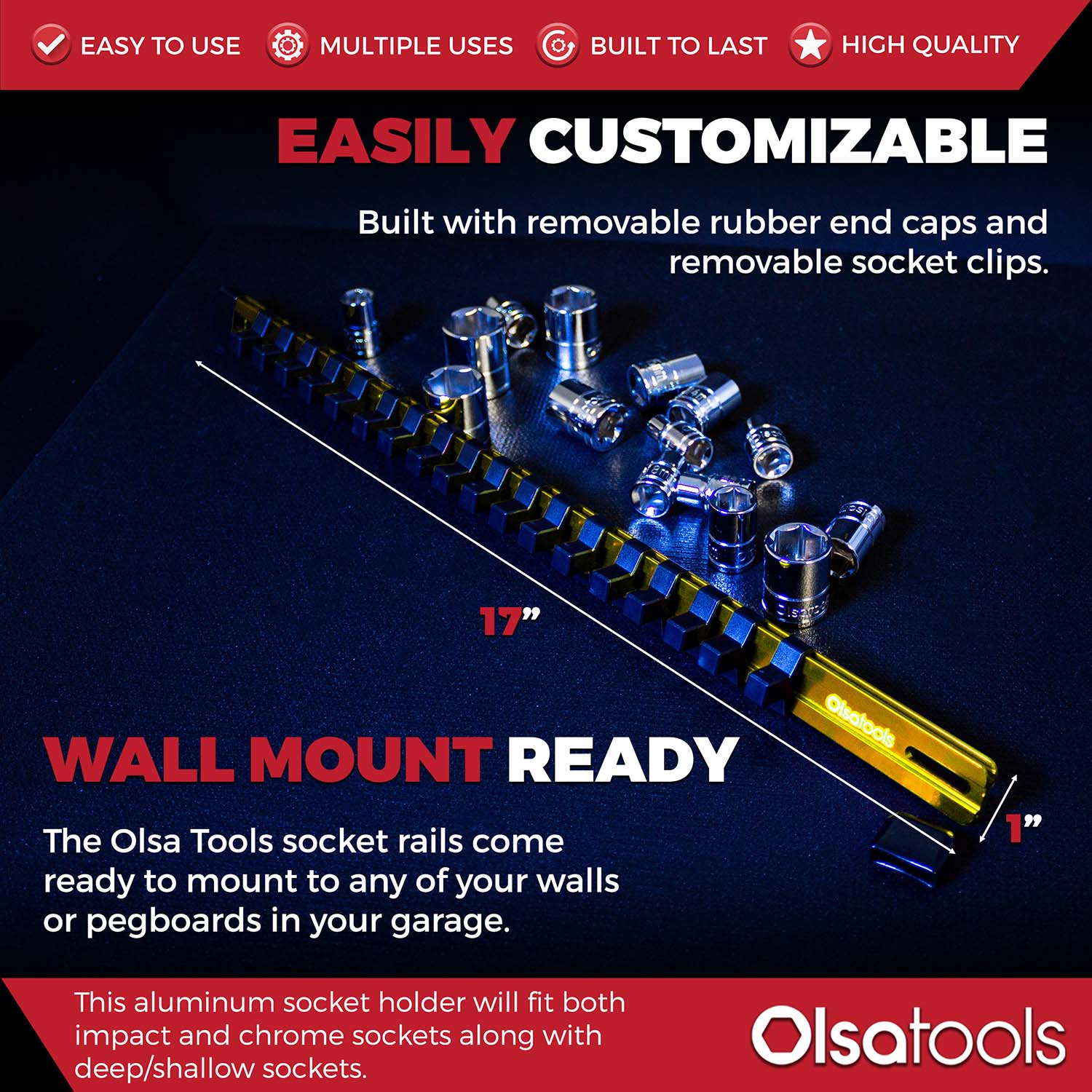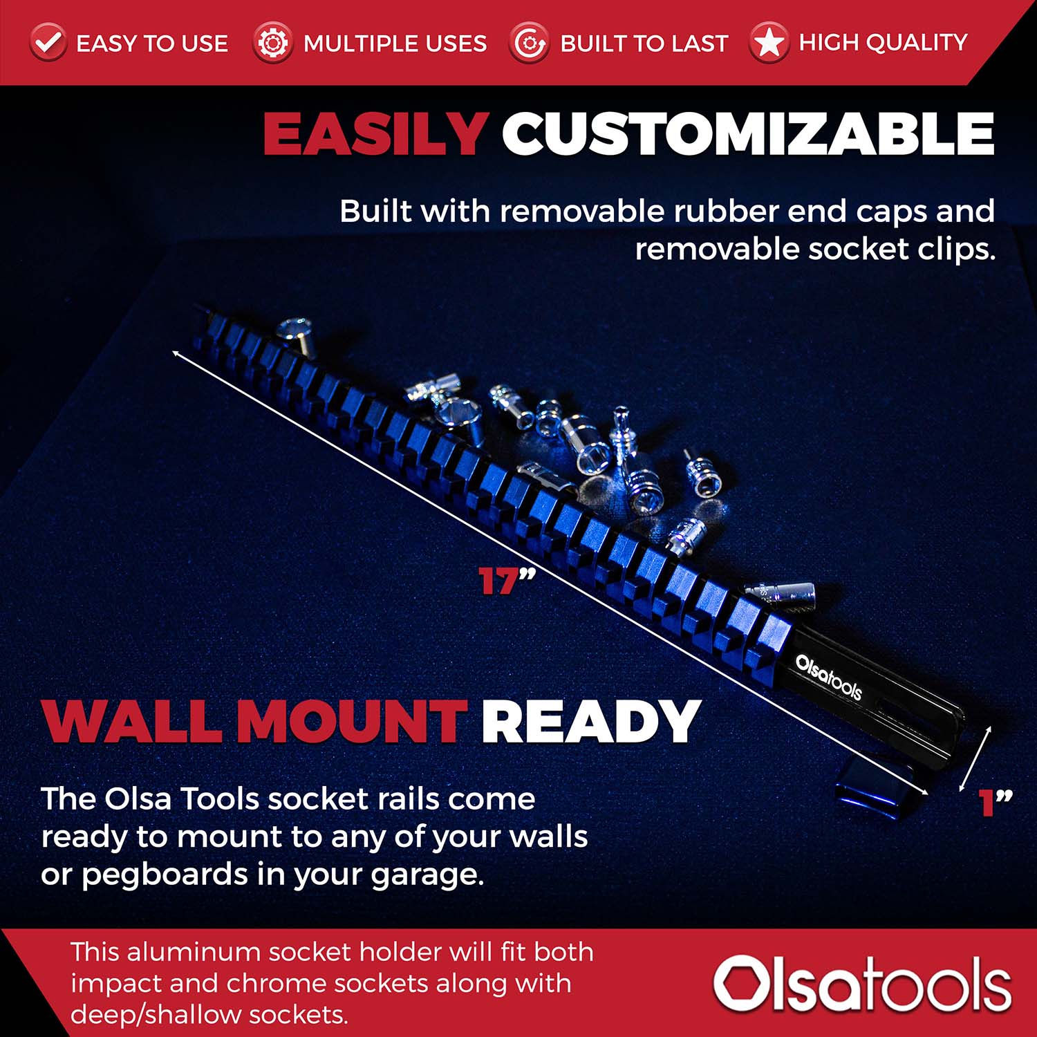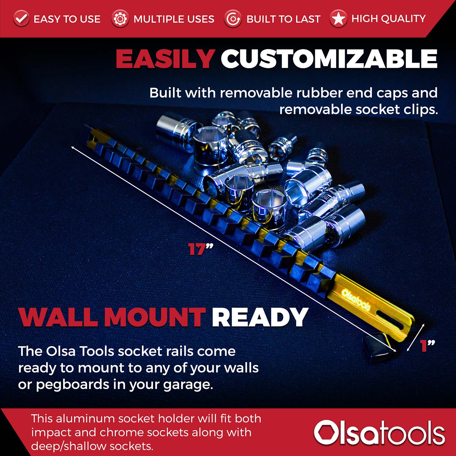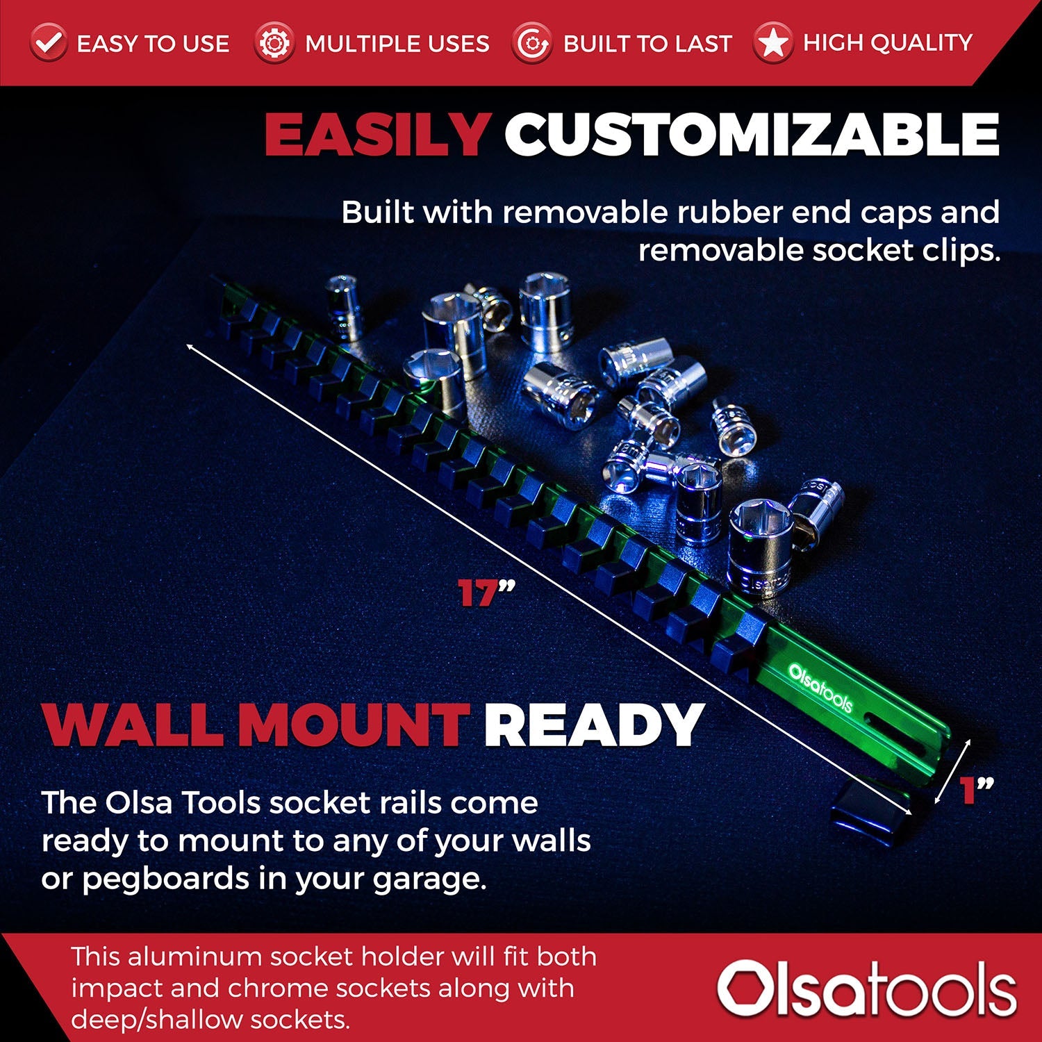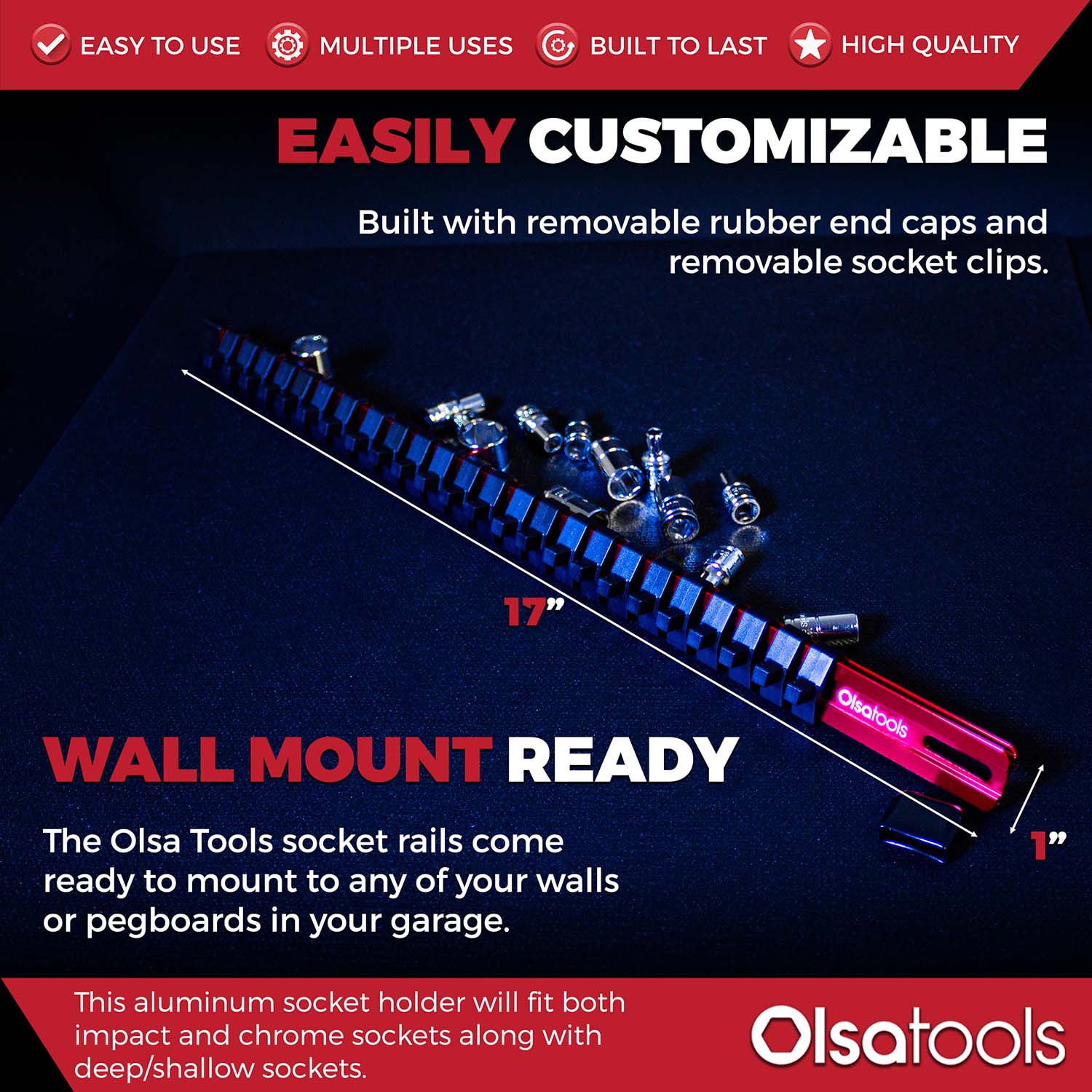 - With the Olsa Tools aluminum socket rails, you can make the most out of your time by spending more time working instead of wasting time looking for loose sockets. Easily organize up to 58 (16x - 1/2-inch, 24x - 1/4-inch, 18x - 3/8-inch) with a 3 pc kit or get individual rails for the perfect set up for your toolbox.