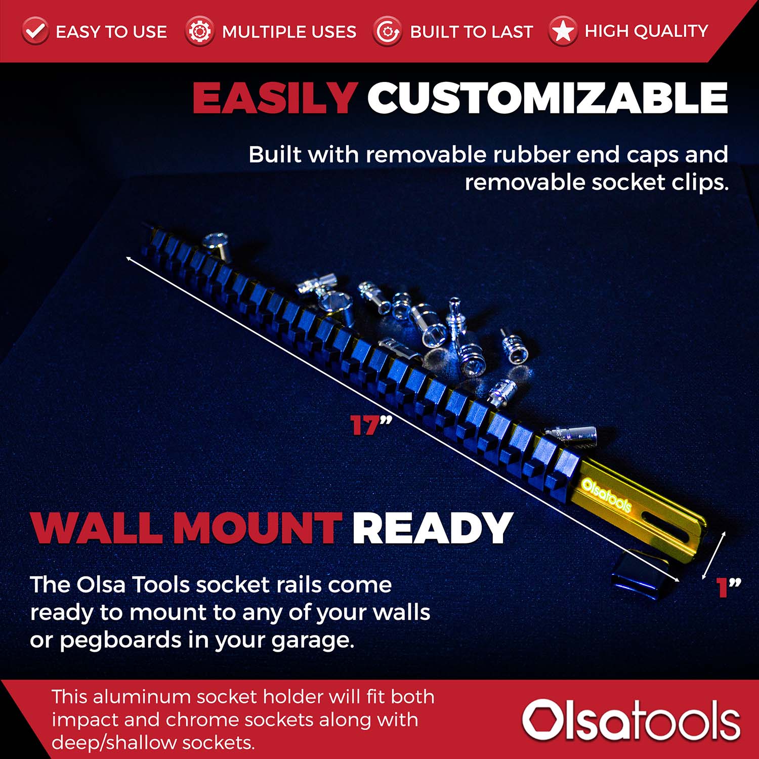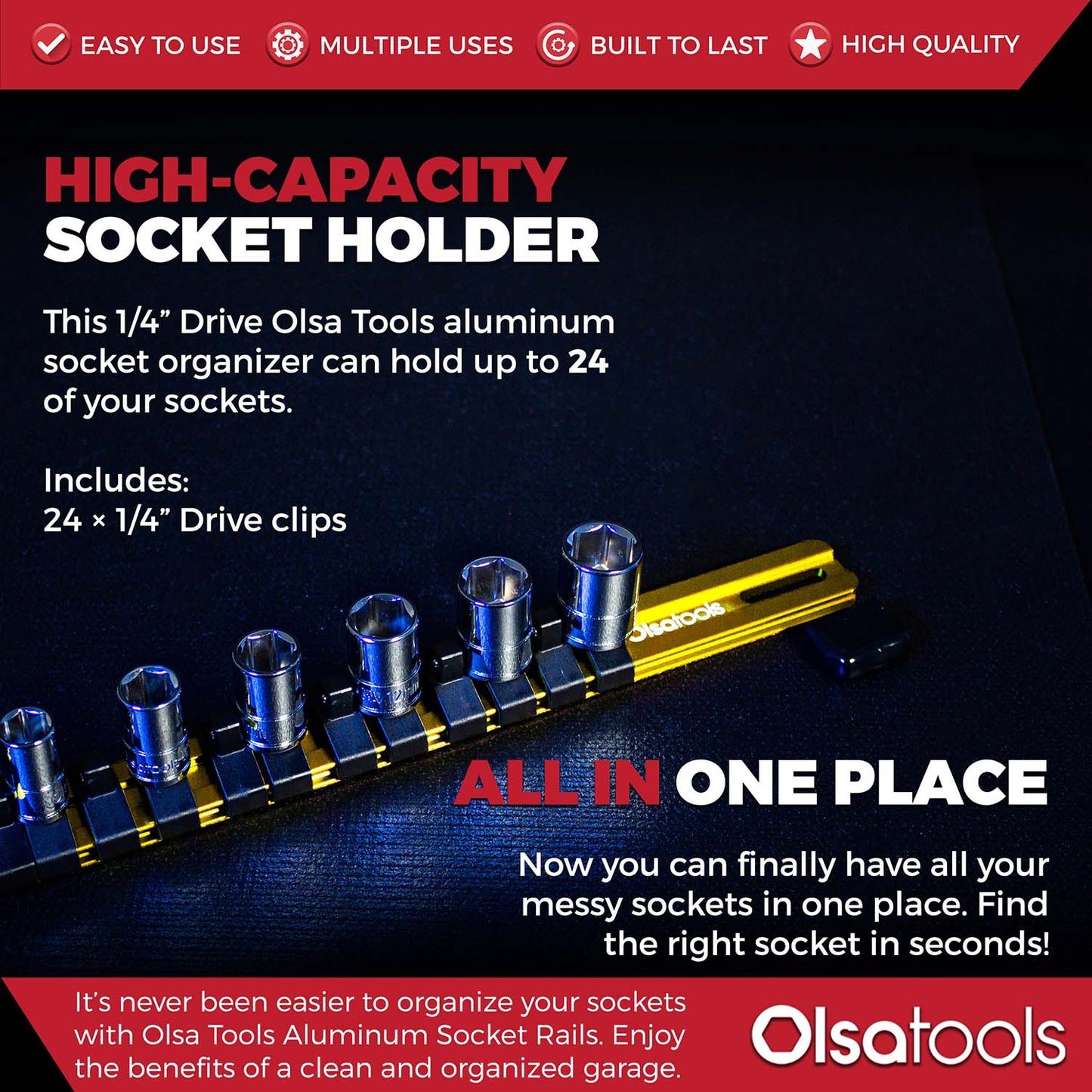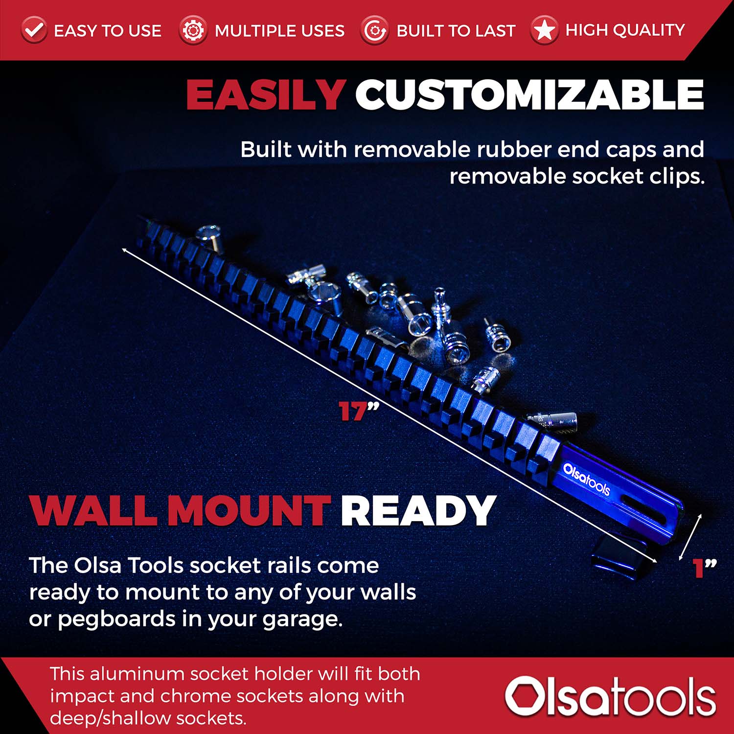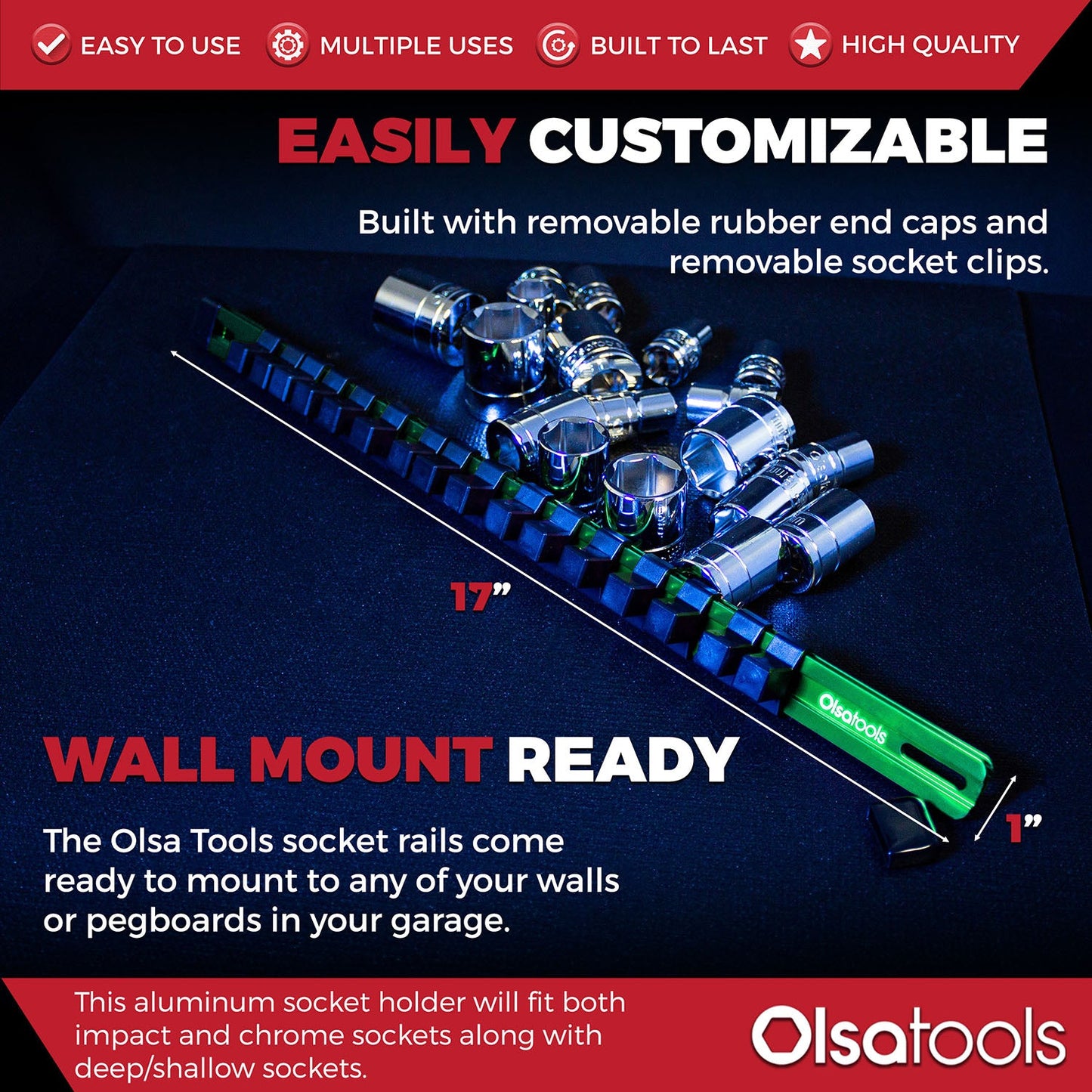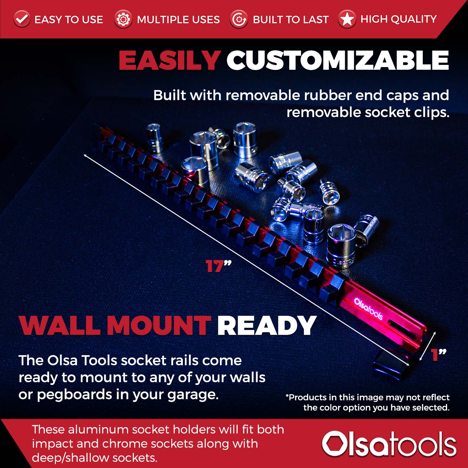- With the Olsa Tools aluminum socket rails, you can make the most out of your time by spending more time working instead of wasting time looking for loose sockets. Easily organize up to 58 (16x - 1/2-inch, 24x - 1/4-inch, 18x - 3/8-inch) with a 3 pc kit or get individual rails for the perfect set up for your toolbox.