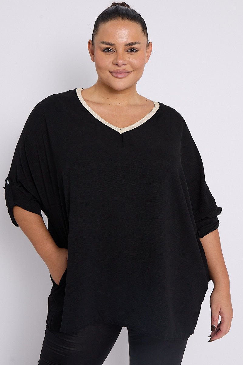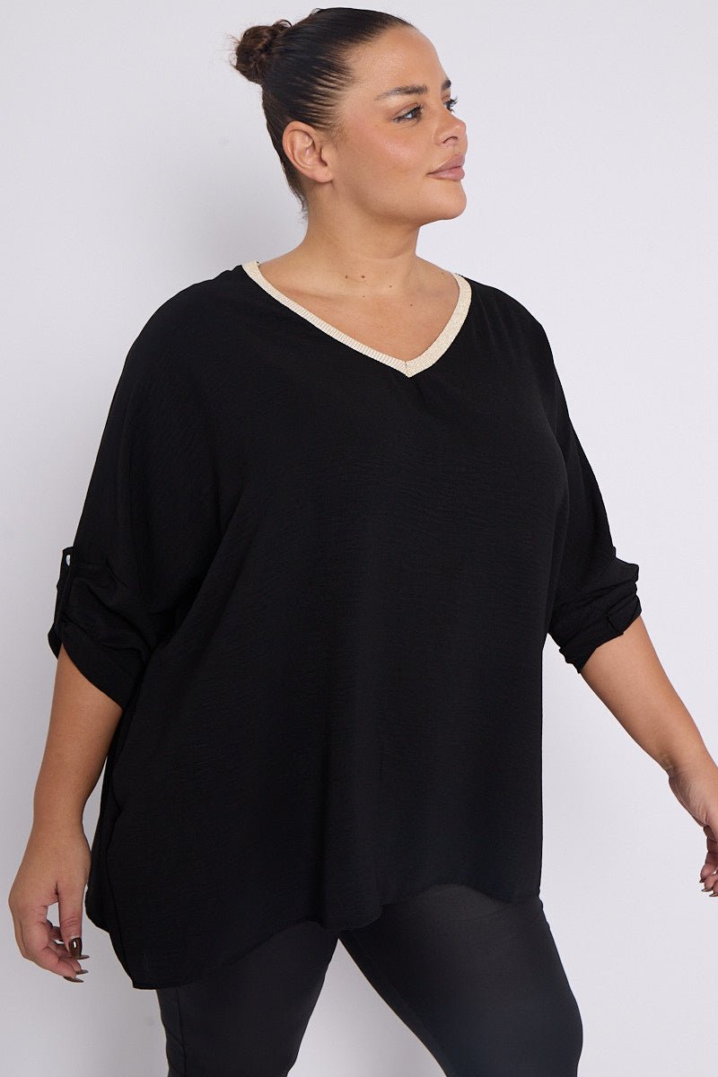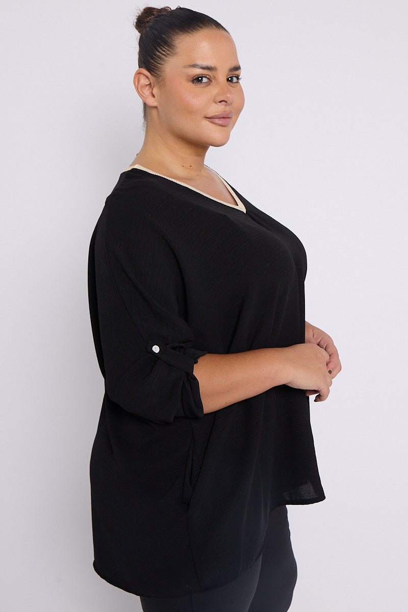 Anya Grande Taille Haut Noir Col V Bordure Contrastante Manches 3/4 Tour avec Poches