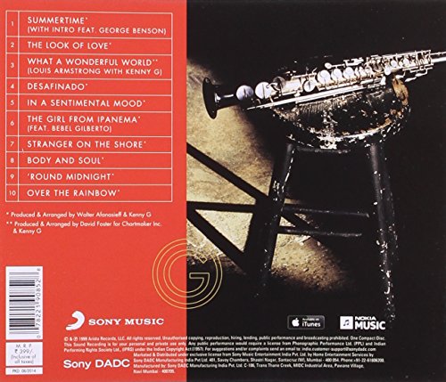 Details: Product description Kenny G ~ Classics In The Key Of G Amazon.ca Offering a tribute to composers of previous generations, soprano saxophonist Kenny G uses his 11th career release to present his interpretations of various standards and assorted chestnuts from the past century. G's approach is as smooth and gentle as ever, and anyone in the market for mild-mannered, relaxing jazz should be satisfied with this package. Highlights include a slowly evolving version of George Gershwin's "Summertime", with George Benson on guitar, and a largely respectful rendering of Monk's "'Round Midnight". Subdued orchestral backing is used throughout the recording, and two vocal selections are included: a "duet" with the Louis Armstrong vocal track from "What a Wonderful World", and the subdued samba of "The Girl from Ipanema". which features singer Bebel Gilberto, daughter of the song's original vocalists. That selection is reprised instrumentally on an un-credited, non-indexed 11th track that is heard about 20 seconds after the conclusion of Harold Arlen's "Over the Rainbow". Languid listening from start to finish. --Terry Wood
