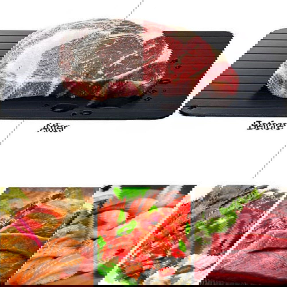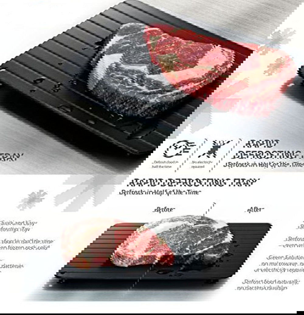 - Le plateau de décongélation est fabriqué en aluminium haute densité, qui peut conduire la chaleur plus rapidement. Le processus de décongélation est 100 % physique. Aucun produit chimique ni électricité n'est utilisé. Contrairement aux fours à micro-ondes qui cuisent partiellement les aliments pendant le processus de décongélation, le plateau décongèle la viande en toute sécurité et rapidement tout en préservant la nutrition et le bon goût des aliments.