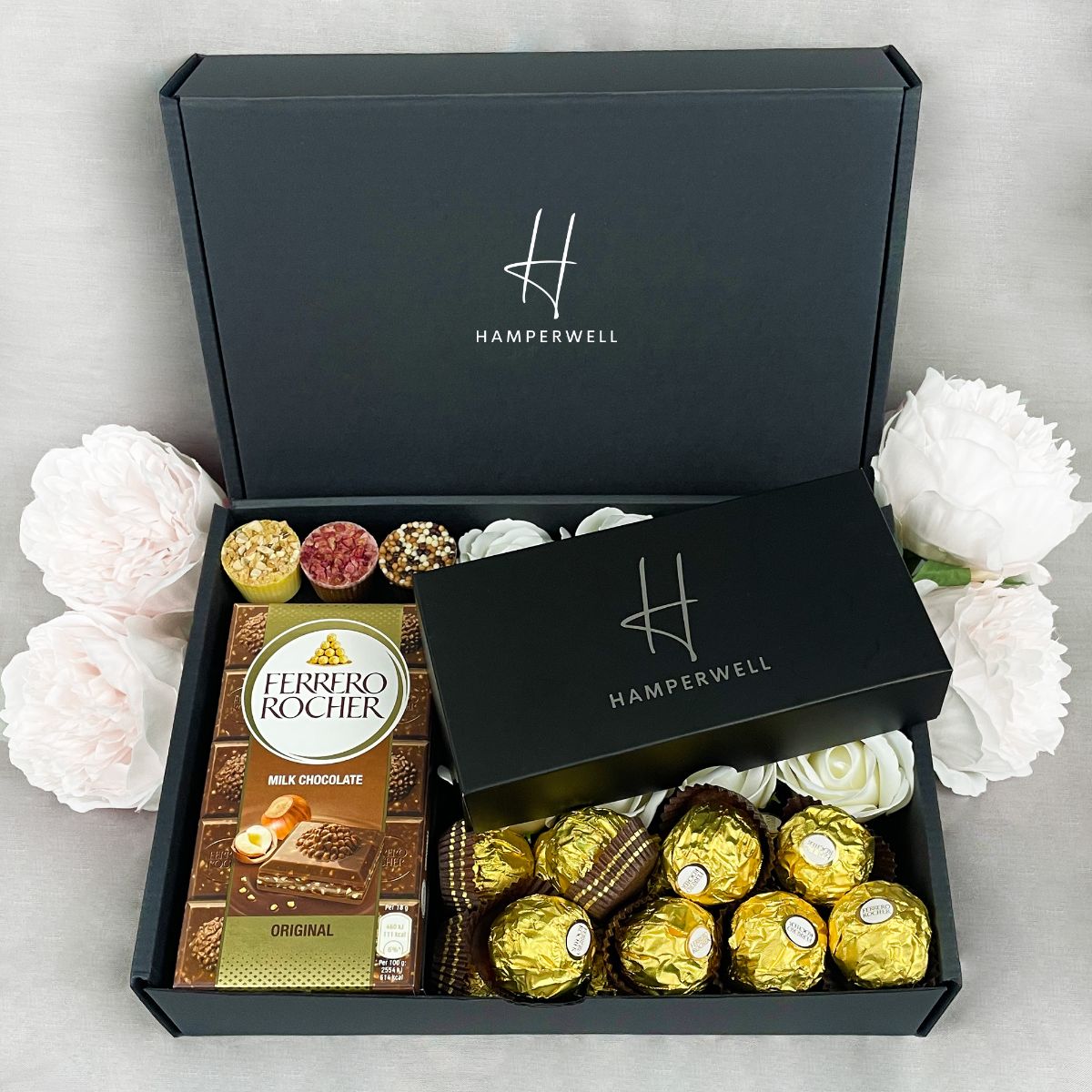 Offrez-vous une expérience unique et luxueuse avec le coffret de chocolats Ferrero Rocher Signature avec roses ivoire. Cet ensemble exquis comprend de délicieux chocolats Ferrero Rocher, des truffes au chocolat faites à la main et une barre de chocolat Ferrero Rocher ainsi que des roses de savon ivoire, disposées dans un élégant plateau de luxe. Parfait pour toute occasion spéciale, ce cadeau sophistiqué fera une impression durable.