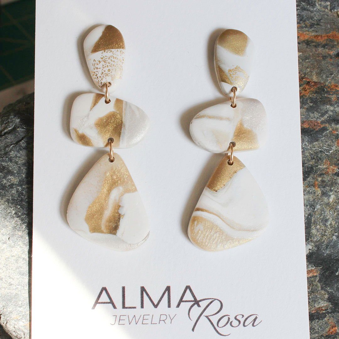 Découvrez l'élégance unique des boucles d'oreilles STONES en pâte polymère d'Alma Rosa Jewelry. Ces boucles d'oreilles saisissantes, réalisées en pâte polymère, mettent en valeur des pierres aux formes irrégulières qui évoquent la quiétude de la nature. Chaque pièce arbore une palette sophistiquée de blanc, noir et gris, rehaussée de luxueux détails en feuille d'or. Parfaites pour ajouter une touche artistique à n'importe quelle tenue.