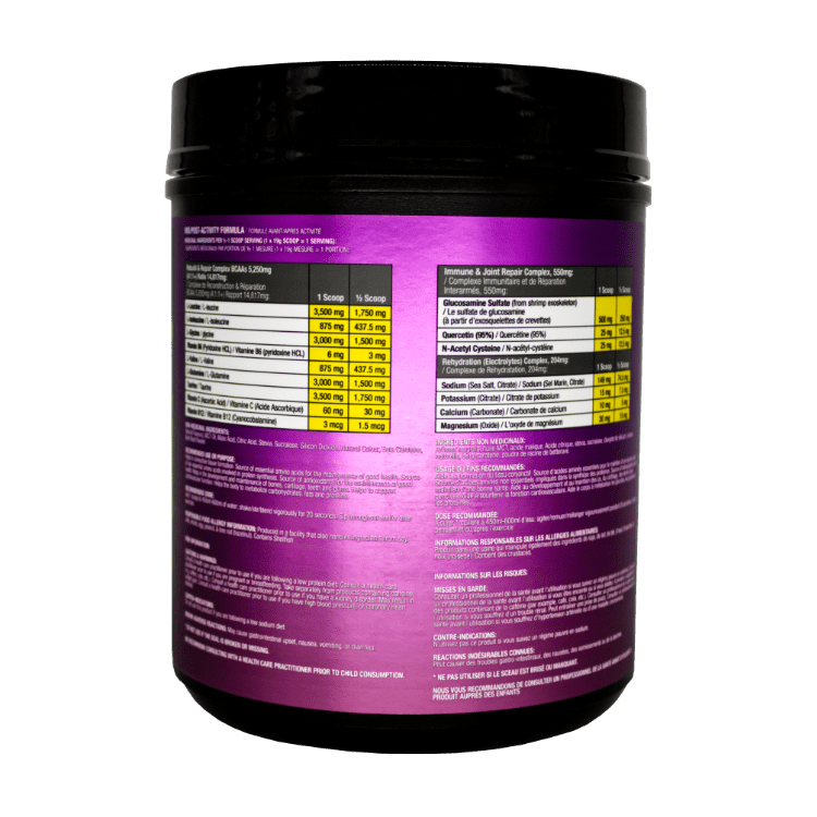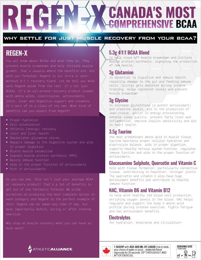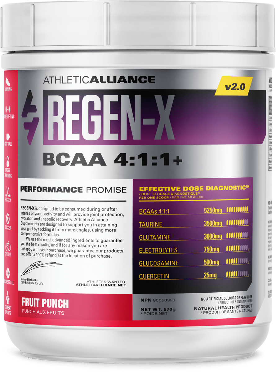 Regen X est notre formule avancée d'acides aminés ramifiés (BCAA) conçue pour répondre aux besoins de récupération lors d'efforts physiques intenses. Les BCAA désignent trois acides aminés principaux : la L-leucine, la L-isoleucine et la L-valine. Regen X a été spécialement conçu selon un ratio de 4:1:1+, ce qui signifie qu'il contient un ratio de L-leucine bien supérieur à celui des autres produits BCAA, généralement de 2:1:1. Regen X est édulcoré à la stévia et ne contient aucun colorant ni édulcorant artificiel, contrairement à tous les compléments Athletic Alliance. Il est également 100 % conforme aux normes antidopage.