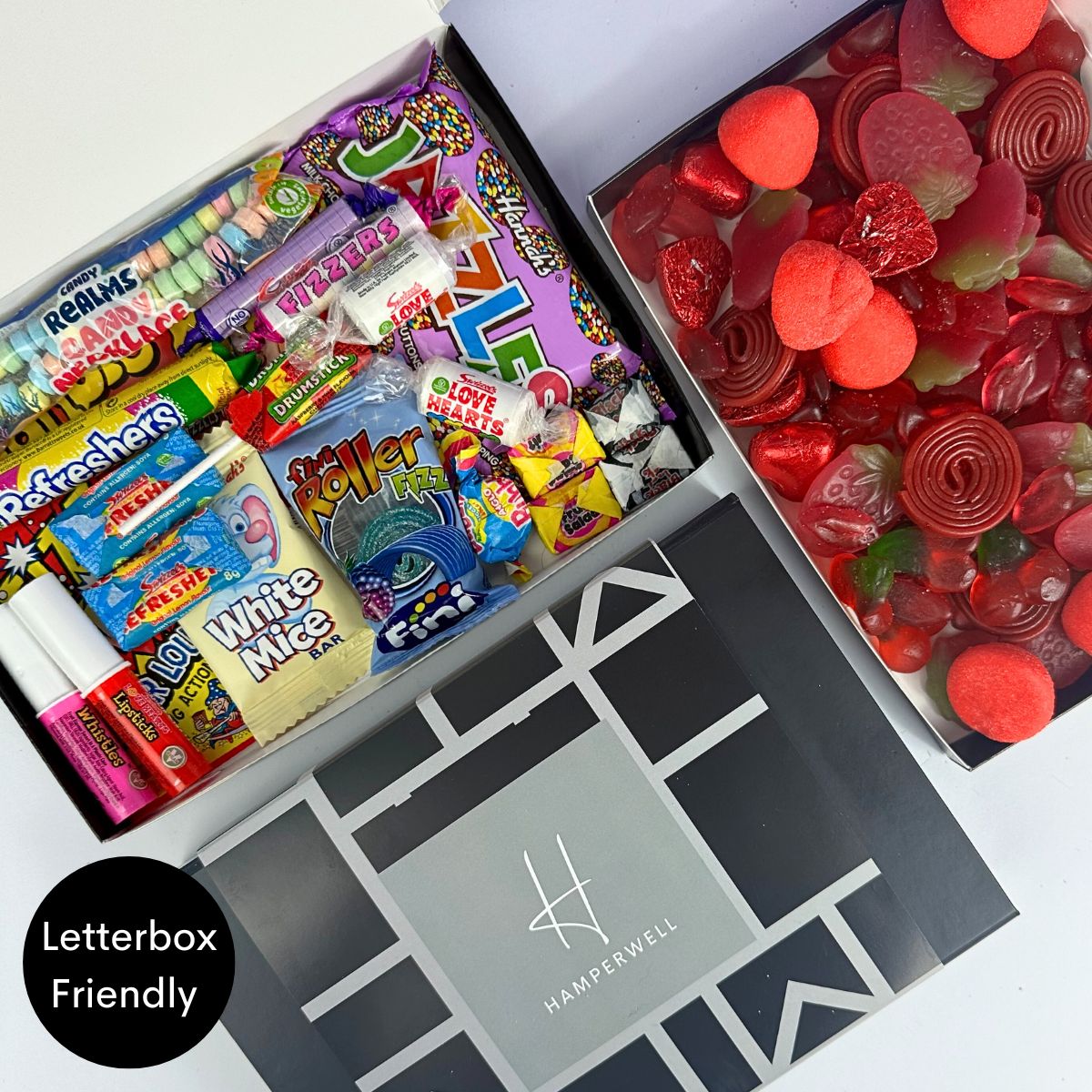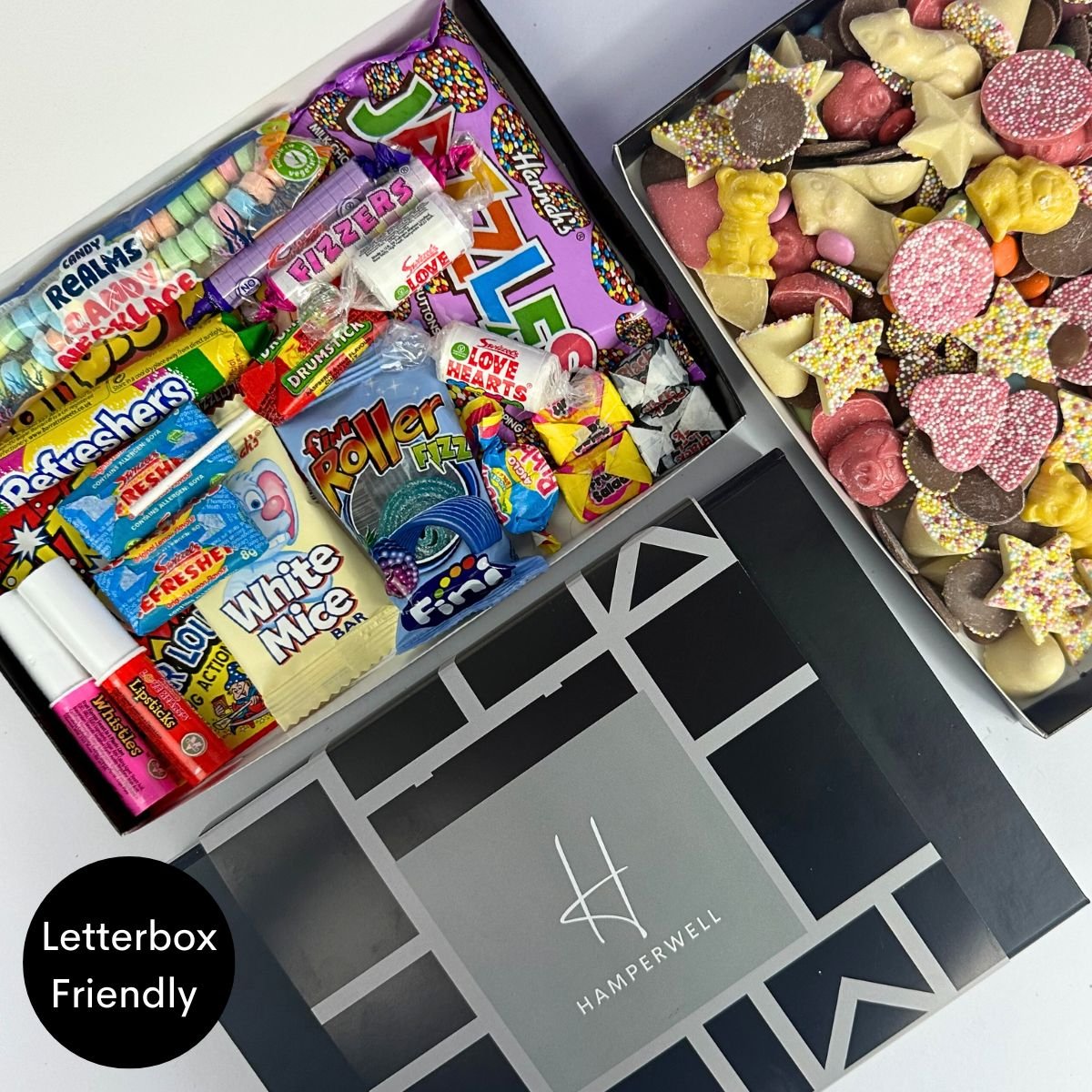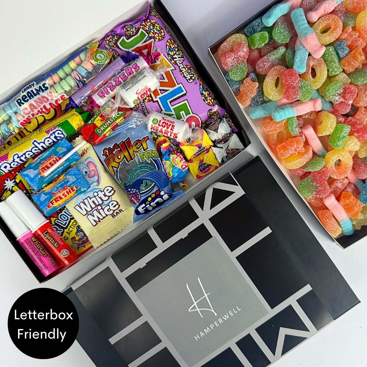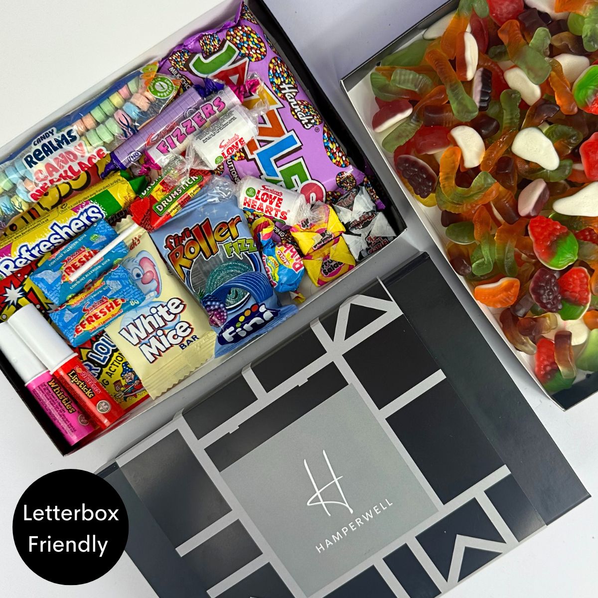 Envoyez de doux cadeaux sans tracas avec notre service de cadeaux en boîte aux lettres. Offrez-vous notre panier-cadeau en boîte aux lettres Retro Sweets contenant des violettes de Parme géantes, une barre à mâcher Vimto, des cœurs d'amour et bien plus encore ! Toutes ces délicieuses friandises sont soigneusement emballées dans un coffret cadeau adapté aux boîtes aux lettres, ce qui permet de les envoyer facilement à vos amis et à votre famille. C'est le moyen idéal de faire savoir à quelqu'un que vous pensez à lui, peu importe où il se trouve.