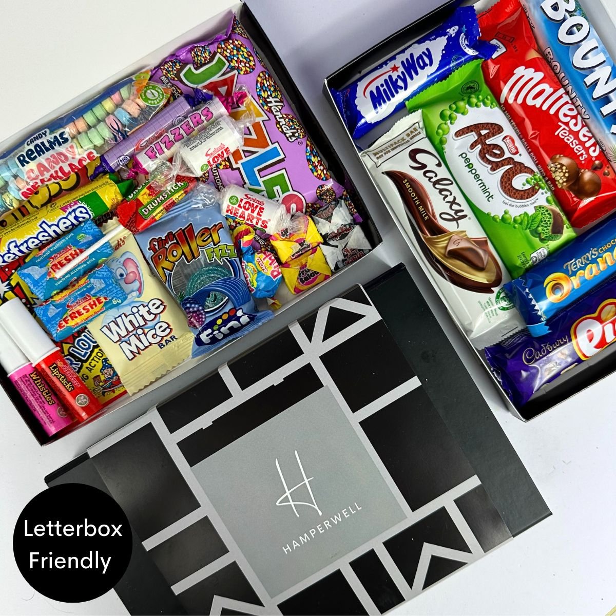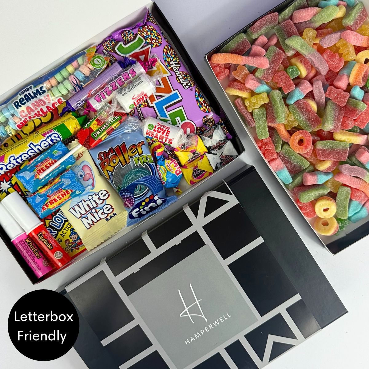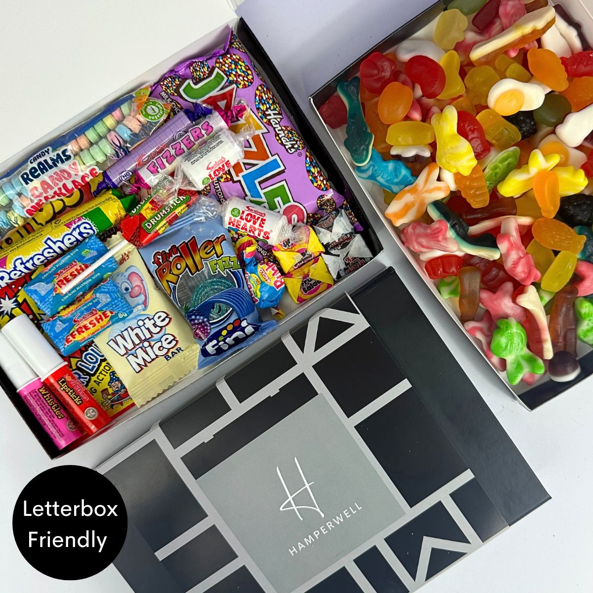 Envoyez de doux cadeaux sans tracas avec notre service de cadeaux en boîte aux lettres. Offrez-vous notre panier-cadeau en boîte aux lettres Retro Sweets contenant des violettes de Parme géantes, une barre à mâcher Vimto, des cœurs d'amour et bien plus encore ! Toutes ces délicieuses friandises sont soigneusement emballées dans un coffret cadeau adapté aux boîtes aux lettres, ce qui permet de les envoyer facilement à vos amis et à votre famille. C'est le moyen idéal de faire savoir à quelqu'un que vous pensez à lui, peu importe où il se trouve.