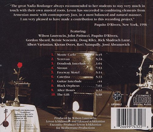 Details: 1 Monte Carbo Accordion - Bernie Senensky, Jossi Abramovich Clarinet - Paquito D'Rivera Drums - Wilson Laurencin Electric Bass - John Patitucci Guitar - Levon Ichkhanian Keyboards - Gordon Sheard 6:45 2 Yerevan Drums - Wilson Laurencin Guitar - Levon Ichkhanian Organ [Hammond] - Doug Riley 5:34 3 Doudouk Interlude Flute [Doudouk] - Albert Vartanian 4:04 4 Siroun Acoustic Bass - Kieran Overs Drums - Wilson Laurencin Flute [Doudouk] - Albert Vartanian Guitar - Levon Ichkhanian Keyboards - Bernie Senensky Percussion - Rick Shadrach Lazar* 7:53 5 Freeway Motel Drums - Wilson Laurencin Guitar - Levon Ichkhanian Organ [Hammond] - Doug Riley 5:14 6 Caterina Acoustic Bass - Kieran Overs Drums - Wilson Laurencin Guitar, Bouzouki - Levon Ichkhanian Harmonica [Synthesizer, Intro] - Bernie Senensky Keyboards - Doug Riley Percussion - Rick Shadrach Lazar* Tabla - Ravi Naimpally 5:33 7 Guitar Interlude Guitar - Levon Ichkhanian 0:44 8 Black Orpheus Alto Saxophone - Paquito D'Rivera Drums - Wilson Laurencin Electric Bass - John Patitucci Guitar - Levon Ichkhanian Keyboards - Gordon Sheard Percussion - Rick Shadrach Lazar* 7:01 9 After Hours Drums - Wilson Laurencin Guitar - Levon Ichkhanian Organ [Hammond] - Doug Riley 4:32 10 The Gift Guitar - Levon Ichkhanian 5:58